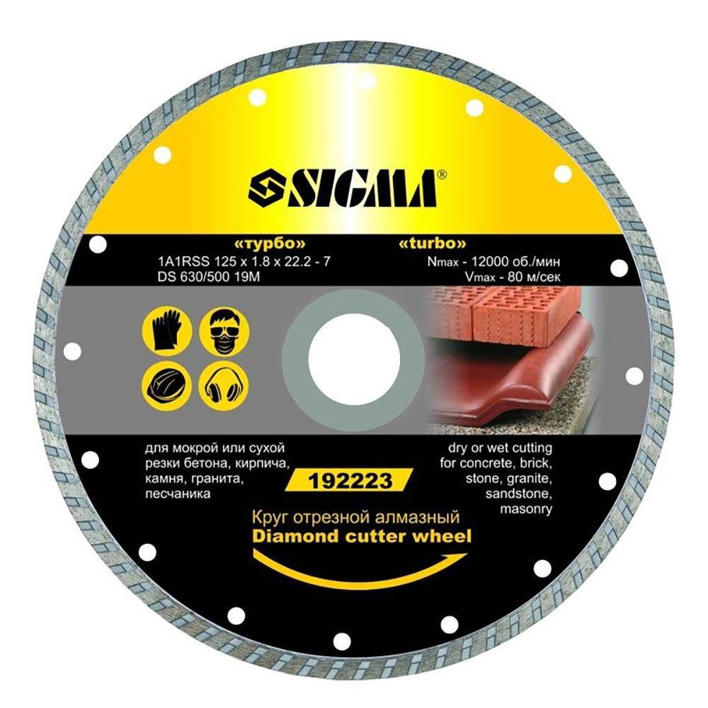 Круг відрізний алмазний "Турбо" Ø110х1.8х22.2 мм, 12000об/хв Sigma (1922211) призначений для мокрого різання будівельних матеріалів великих розмірів.